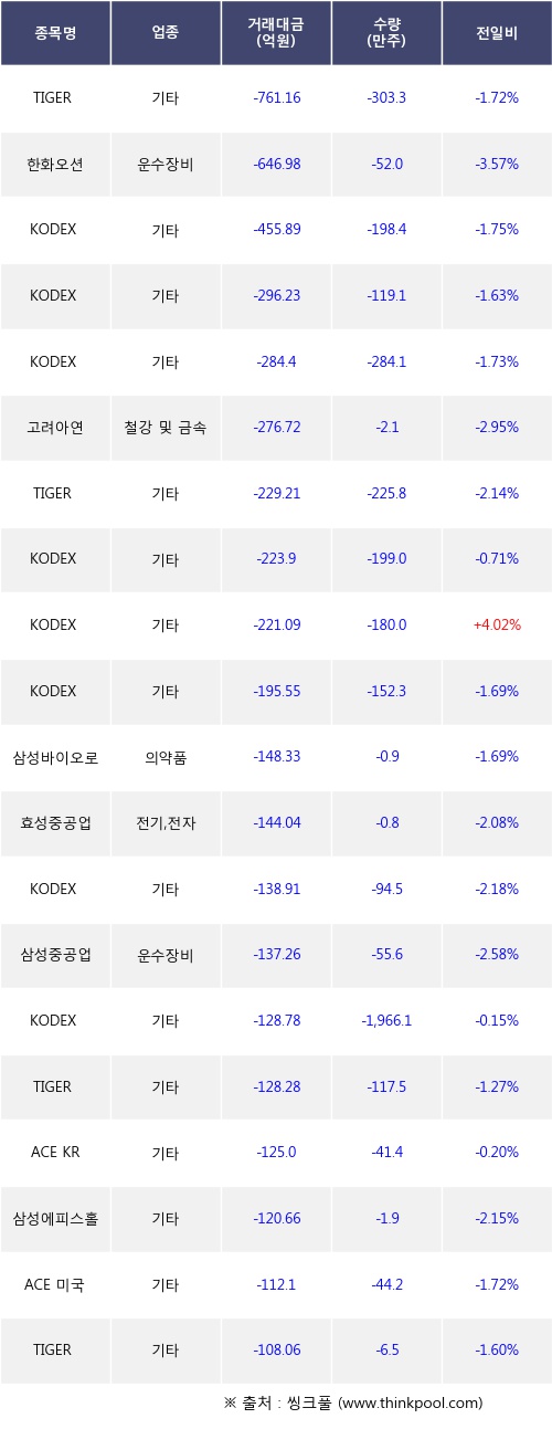 기관 투자자의 순매도 상위 20개 종목은 TIGER 미국S&P500, 한화오션, KODEX 미국S&P500, KODEX 미국나스닥100, KODEX 미국성장커버드콜액티브, 고려아연, TIGER 미국초단기(3개월이하)국채, KODEX 코스닥150레버리지, KODEX 은선물(H), KODEX 미국배당커버드콜액티브등이다.