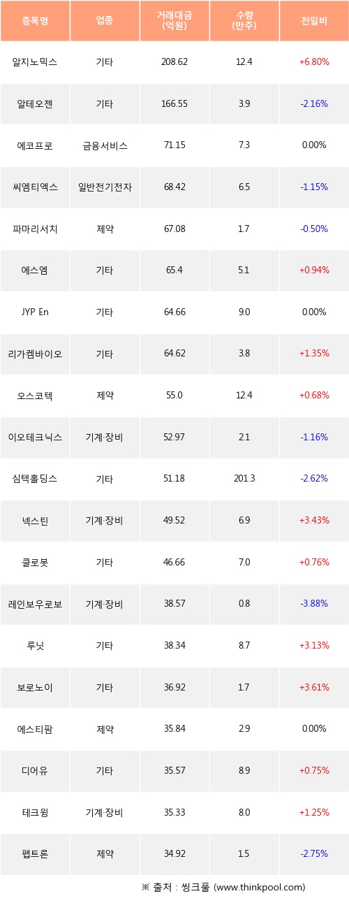 알지노믹스, 에스엠, 리가켐바이오 등은 전일 대비 주가가 상승했고, 알테오젠, 씨엠티엑스, 파마리서치 등은 주가가 하락했다.