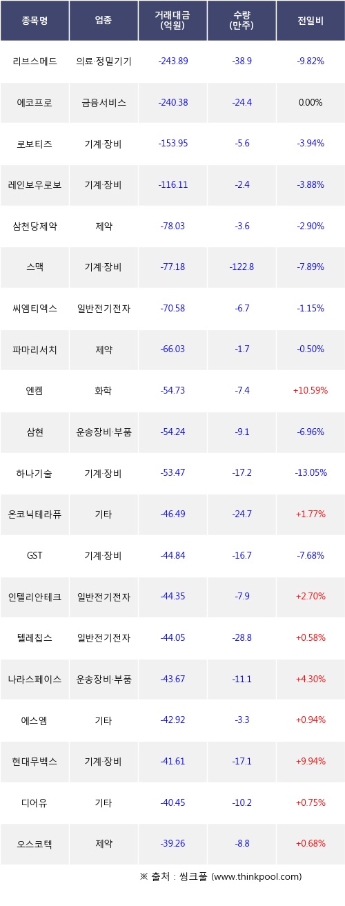 외국인 투자자의 순매도 상위 20개 종목은 리브스메드, 에코프로, 로보티즈, 레인보우로보틱스, 삼천당제약, 스맥, 씨엠티엑스, 파마리서치, 엔켐, 삼현등이다.