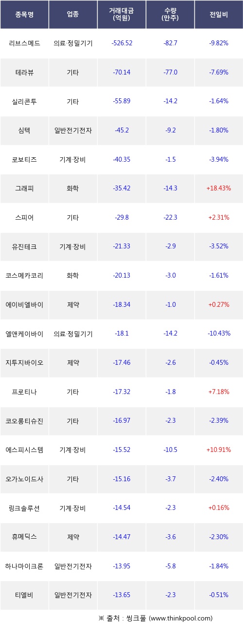 기관 투자자의 순매도 상위 20개 종목은 리브스메드, 테라뷰, 실리콘투, 심텍, 로보티즈, 그래피, 스피어, 유진테크, 코스메카코리아, 에이비엘바이오등이다.