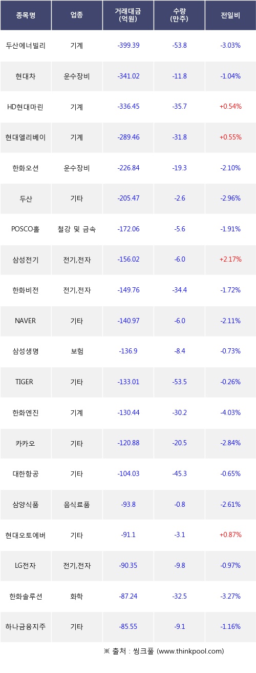 외국인 투자자의 순매도 상위 20개 종목은 두산에너빌리티, 현대차, HD현대마린엔진, 현대엘리베이터, 한화오션, 두산, POSCO홀딩스, 삼성전기, 한화비전, NAVER등이다.