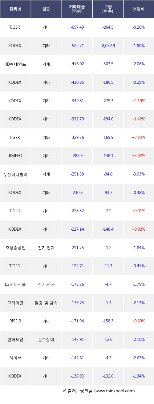 기관 투자자의 순매도 상위 20개 종목은 TIGER 미국S&P500, KODEX 200선물인버스2X, HD현대인프라코어, KODEX 미국S&P500, KODEX 은선물(H), KODEX 코스닥150레버리지, TIGER 반도체TOP10, TIMEFOLIO K바이오액티브, 두산에너빌리티, KODEX 미국나스닥100등이다.