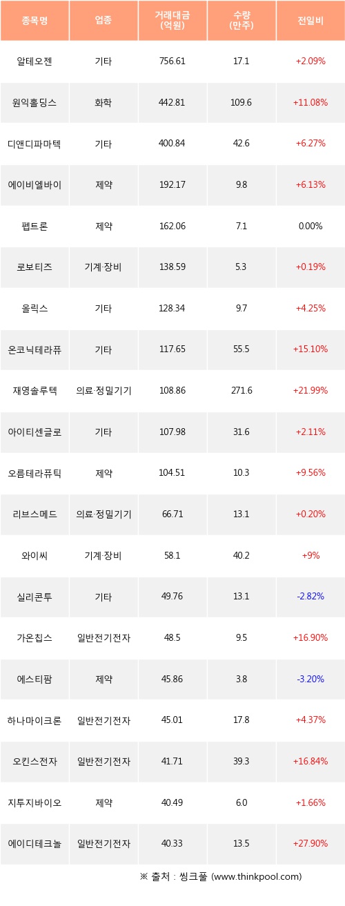 외국인 투자자의 순매수 상위 20개 종목은 알테오젠, 원익홀딩스, 디앤디파마텍, 에이비엘바이오, 펩트론, 로보티즈, 올릭스, 온코닉테라퓨틱스, 재영솔루텍, 아이티센글로벌등이다.