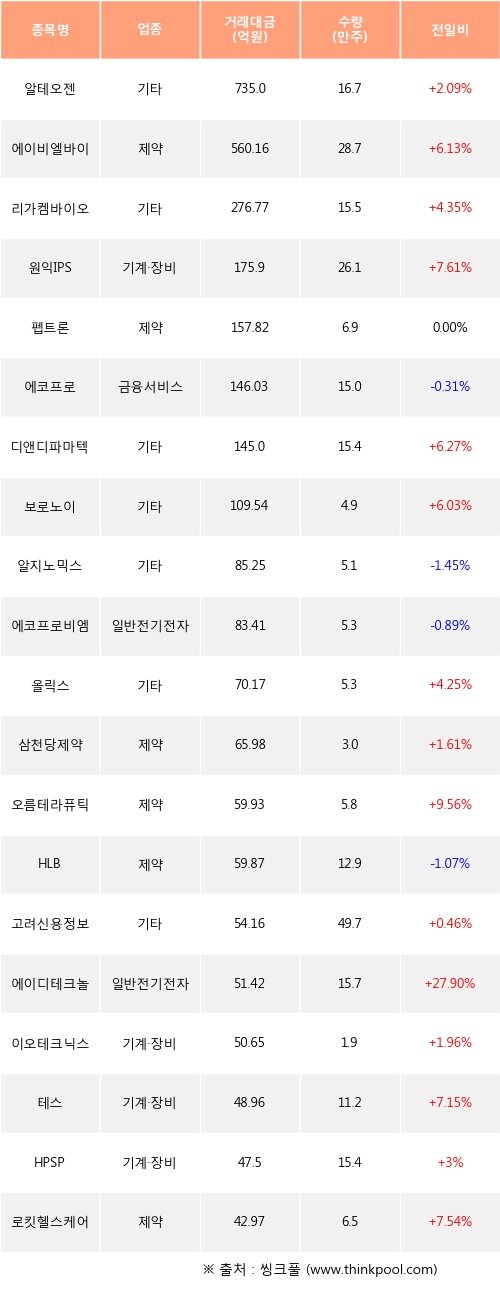 알테오젠, 에이비엘바이오, 리가켐바이오 등은 전일 대비 주가가 상승했고, 에코프로, 알지노믹스, 에코프로비엠 등은 주가가 하락했다.