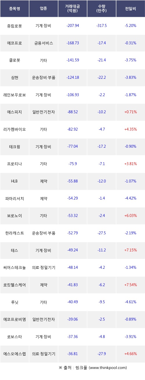외국인 투자자의 순매도 상위 20개 종목은 휴림로봇, 에코프로, 클로봇, 삼현, 레인보우로보틱스, 에스피지, 리가켐바이오, 테크윙, 프로티나, HLB등이다.