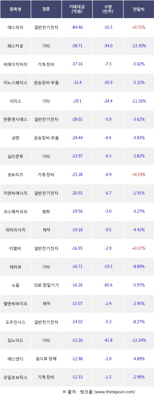 기관 투자자의 순매도 상위 20개 종목은 에스피지, 페스카로, 비에이치아이, 이노스페이스, 이지스, 한중엔시에스, 삼현, 실리콘투, 로보티즈, 지엔씨에너지등이다.
