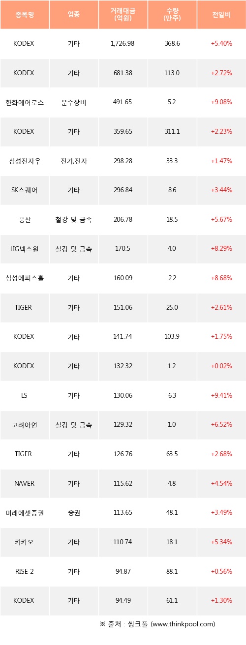 이날 기관 투자자가 순매수한 종목들 중에 KODEX 레버리지, KODEX 200, 한화에어로스페이스 등은 전일 대비 주가가 상승했다.