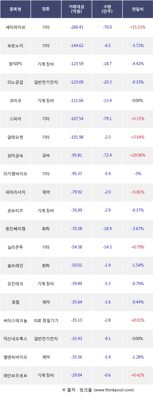 기관 투자자의 순매도 상위 20개 종목은 세미파이브, 보로노이, 원익IPS, 리노공업, 코미코, 스피어, 알테오젠, 삼미금속, 리가켐바이오, 파마리서치등이다.