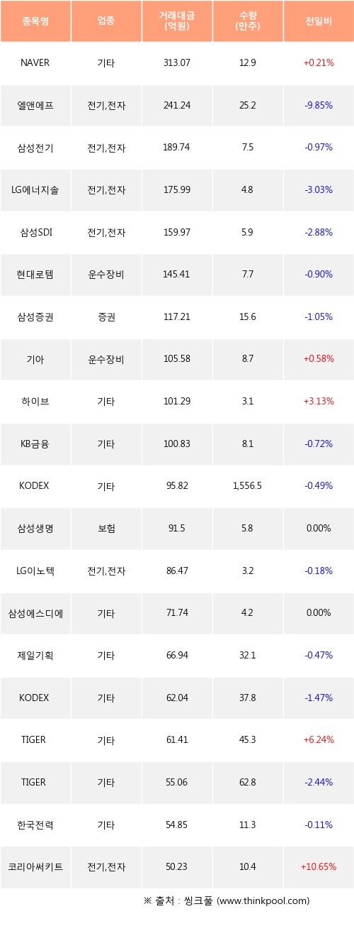 외국인 투자자의 순매수 상위 20개 종목은 NAVER, 엘앤에프, 삼성전기, LG에너지솔루션, 삼성SDI, 현대로템, 삼성증권, 기아, 하이브, KB금융등이다.