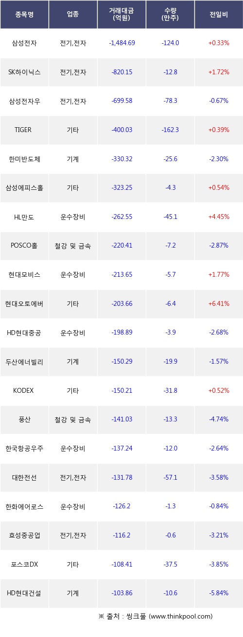 외국인 투자자의 순매도 상위 20개 종목은 삼성전자, SK하이닉스, 삼성전자우, TIGER 미국S&P500, 한미반도체, 삼성에피스홀딩스, HL만도, POSCO홀딩스, 현대모비스, 현대오토에버등이다.