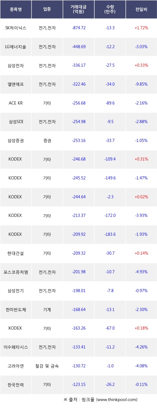 기관 투자자의 순매도 상위 20개 종목은 SK하이닉스, LG에너지솔루션, 삼성전자, 엘앤에프, ACE KRX금현물, 삼성SDI, 삼성증권, KODEX 미국S&P500, KODEX 미국AI전력핵심인프라, KODEX CD금리액티브(합성)등이다.