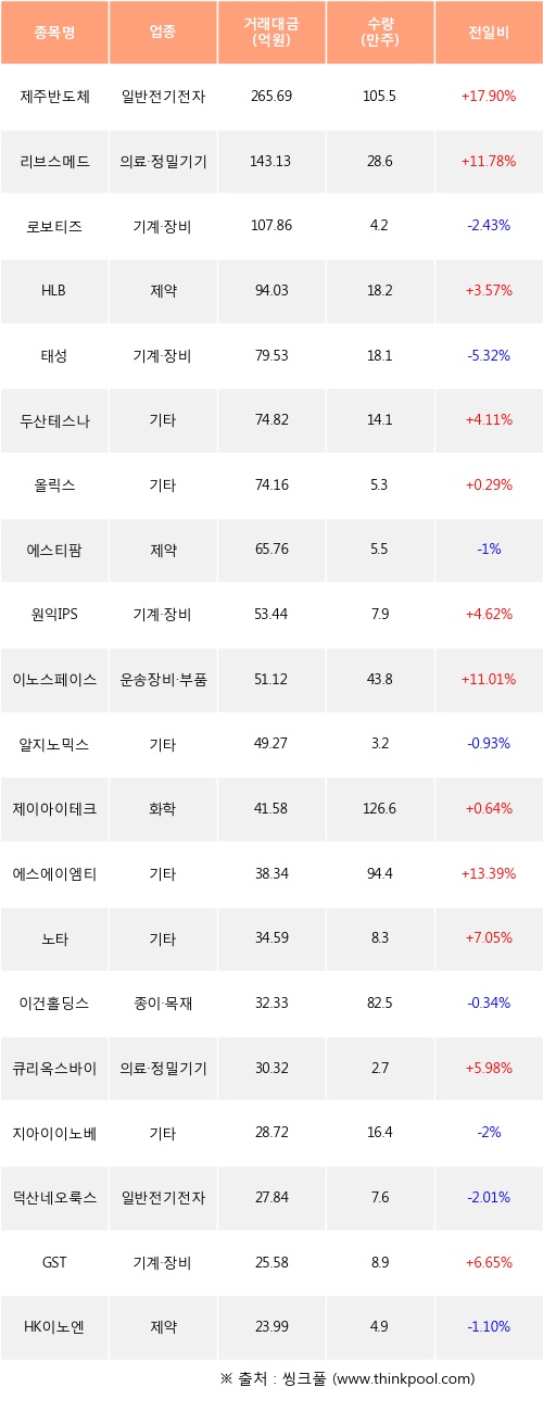 외국인 투자자의 순매수 상위 20개 종목은 제주반도체, 리브스메드, 로보티즈, HLB, 태성, 두산테스나, 올릭스, 에스티팜, 원익IPS, 이노스페이스등이다.