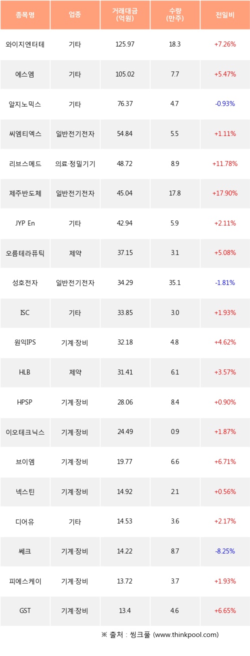 기관 투자자의 순매수 상위 20개 종목은 와이지엔터테인먼트, 에스엠, 알지노믹스, 씨엠티엑스, 리브스메드, 제주반도체, JYP Ent., 오름테라퓨틱, 성호전자, ISC등이다.