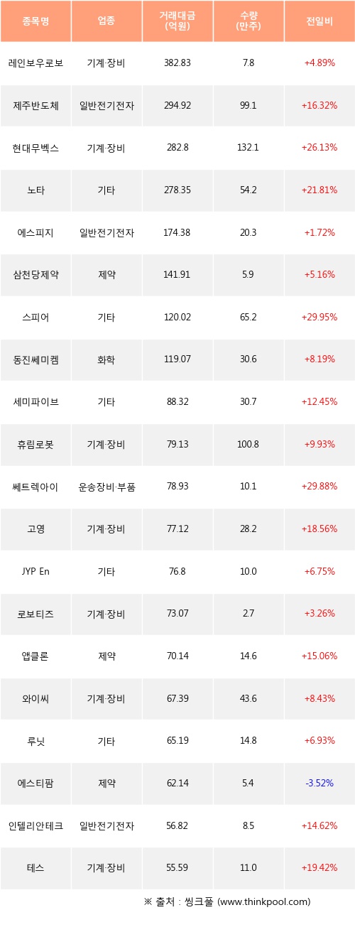 레인보우로보틱스, 제주반도체, 현대무벡스 등은 전일 대비 주가가 상승했고, 에스티팜 등은 주가가 하락했다.
