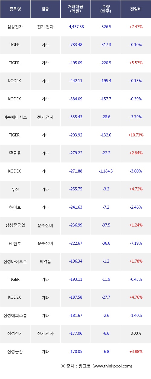기관 투자자의 순매도 상위 20개 종목은 삼성전자, TIGER 미국S&P500, TIGER 반도체TOP10, KODEX 미국S&P500, KODEX 미국나스닥100, 이수페타시스, TIGER 반도체TOP10레버리지, KB금융, KODEX 인버스, 두산등이다.