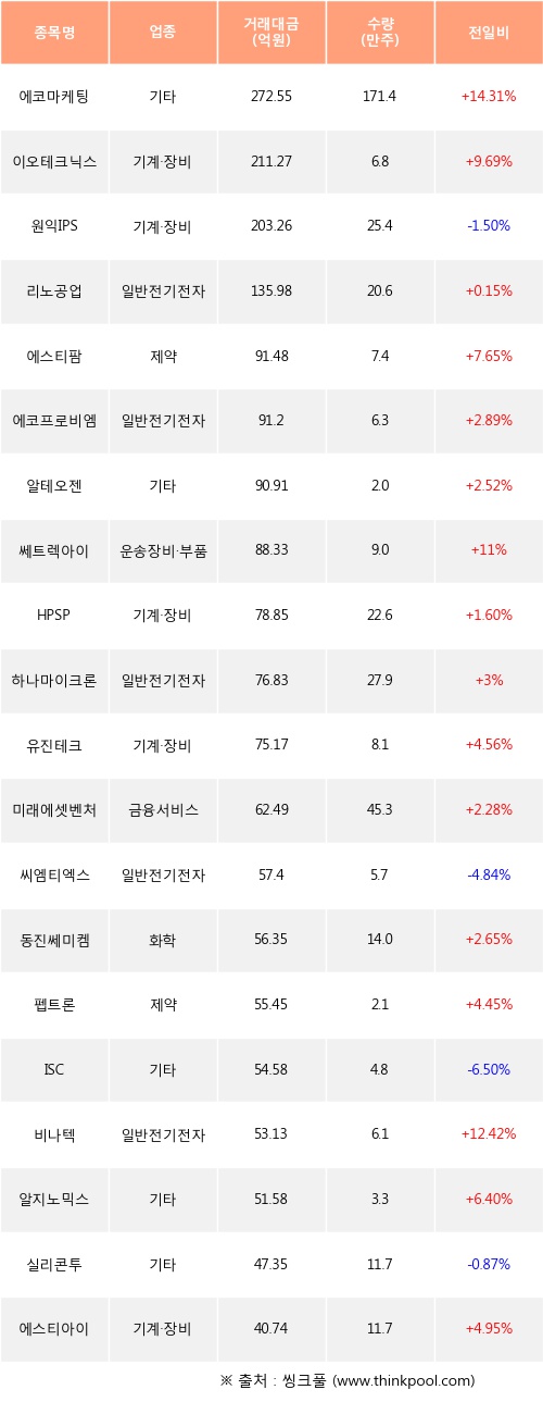 에코마케팅, 이오테크닉스, 리노공업 등은 전일 대비 주가가 상승했고, 원익IPS, 씨엠티엑스, ISC 등은 주가가 하락했다.