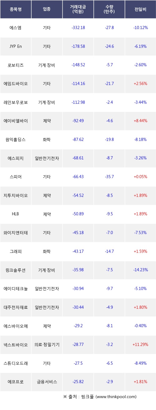 기관 투자자의 순매도 상위 20개 종목은 에스엠, JYP Ent., 로보티즈, 에임드바이오, 레인보우로보틱스, 에이비엘바이오, 원익홀딩스, 에스피지, 스피어, 지투지바이오등이다.