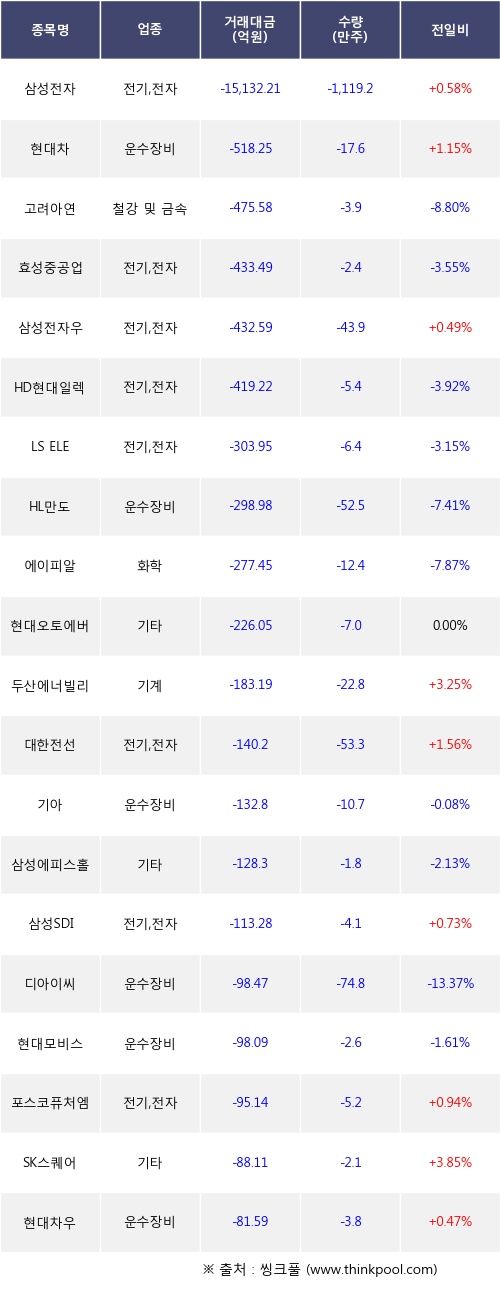외국인 투자자의 순매도 상위 20개 종목은 삼성전자, 현대차, 고려아연, 효성중공업, 삼성전자우, HD현대일렉트릭, LS ELECTRIC, HL만도, 에이피알, 현대오토에버등이다.