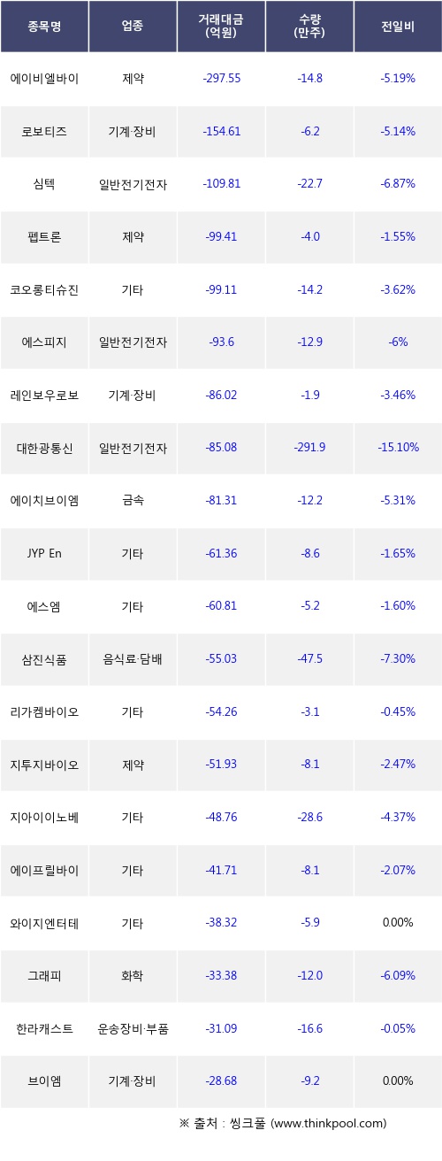 기관 투자자의 순매도 상위 20개 종목은 에이비엘바이오, 로보티즈, 심텍, 펩트론, 코오롱티슈진, 에스피지, 레인보우로보틱스, 대한광통신, 에이치브이엠, JYP Ent.등이다.