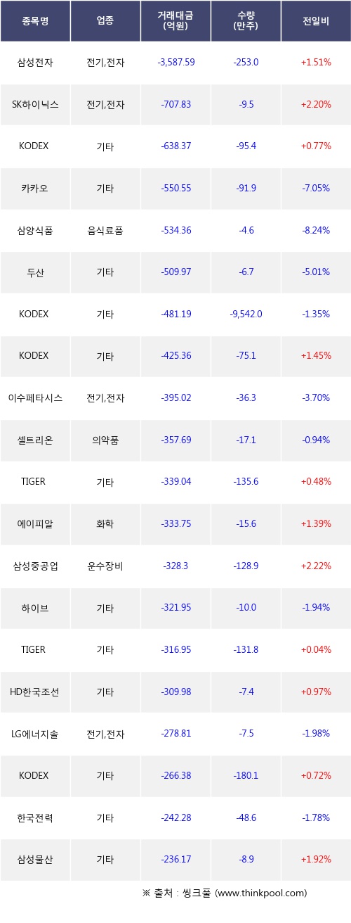기관 투자자의 순매도 상위 20개 종목은 삼성전자, SK하이닉스, KODEX 200, 카카오, 삼양식품, 두산, KODEX 200선물인버스2X, KODEX 레버리지, 이수페타시스, 셀트리온등이다.