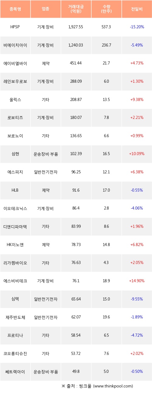 외국인 투자자의 순매수 상위 20개 종목은 HPSP, 비에이치아이, 에이비엘바이오, 레인보우로보틱스, 올릭스, 로보티즈, 보로노이, 삼현, 에스피지, HLB등이다.