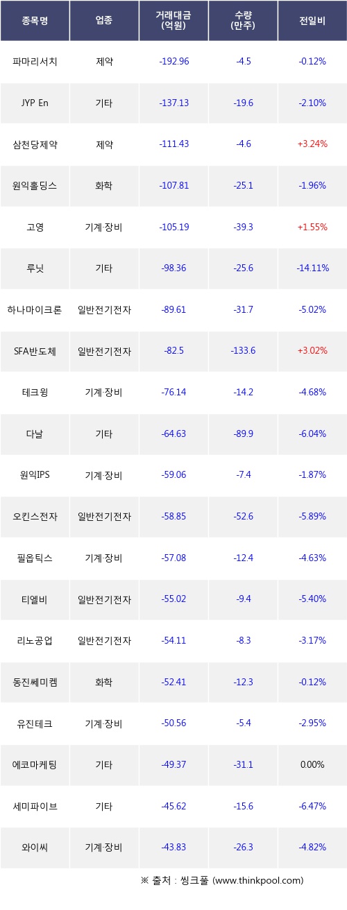 외국인 투자자의 순매도 상위 20개 종목은 파마리서치, JYP Ent., 삼천당제약, 원익홀딩스, 고영, 루닛, 하나마이크론, SFA반도체, 테크윙, 다날등이다.
