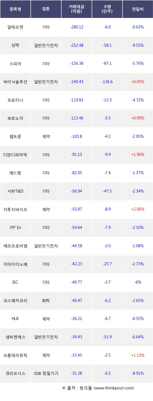 기관 투자자의 순매도 상위 20개 종목은 알테오젠, 심텍, 스피어, 싸이닉솔루션, 프로티나, 보로노이, 펩트론, 디앤디파마텍, 에스엠, 서부T&D등이다.
