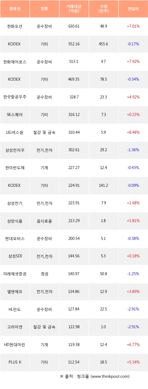 한화오션, 한화에어로스페이스, 한국항공우주 등은 전일 대비 주가가 상승했고, KODEX 코스닥150레버리지, KODEX 레버리지, 삼성전자우 등은 주가가 하락했다.