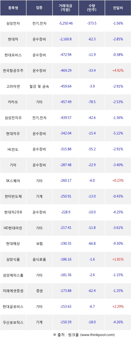 외국인 투자자의 순매도 상위 20개 종목은 삼성전자, 현대차, 현대모비스, 한국항공우주, 고려아연, 카카오, 삼성전자우, 현대차우, HL만도, 기아등이다.