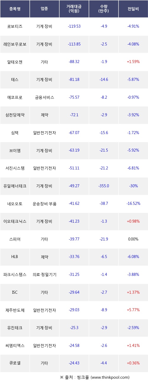 기관 투자자의 순매도 상위 20개 종목은 로보티즈, 레인보우로보틱스, 알테오젠, 테스, 에코프로, 삼천당제약, 심텍, 브이엠, 서진시스템, 유일에너테크등이다.