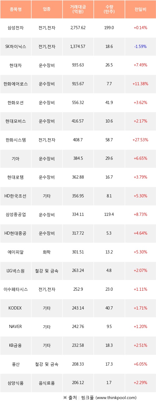 기관 투자자의 순매수 상위 20개 종목은 삼성전자, SK하이닉스, 현대차, 한화에어로스페이스, 한화오션, 현대모비스, 한화시스템, 기아, 현대로템, HD한국조선해양등이다.