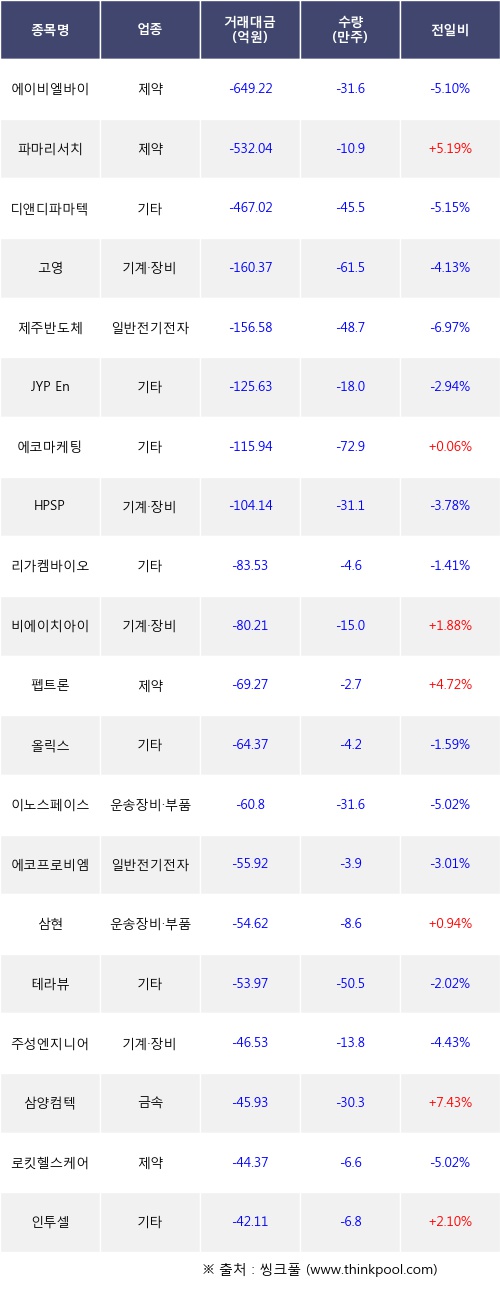 외국인 투자자의 순매도 상위 20개 종목은 에이비엘바이오, 파마리서치, 디앤디파마텍, 고영, 제주반도체, JYP Ent., 에코마케팅, HPSP, 리가켐바이오, 비에이치아이등이다.