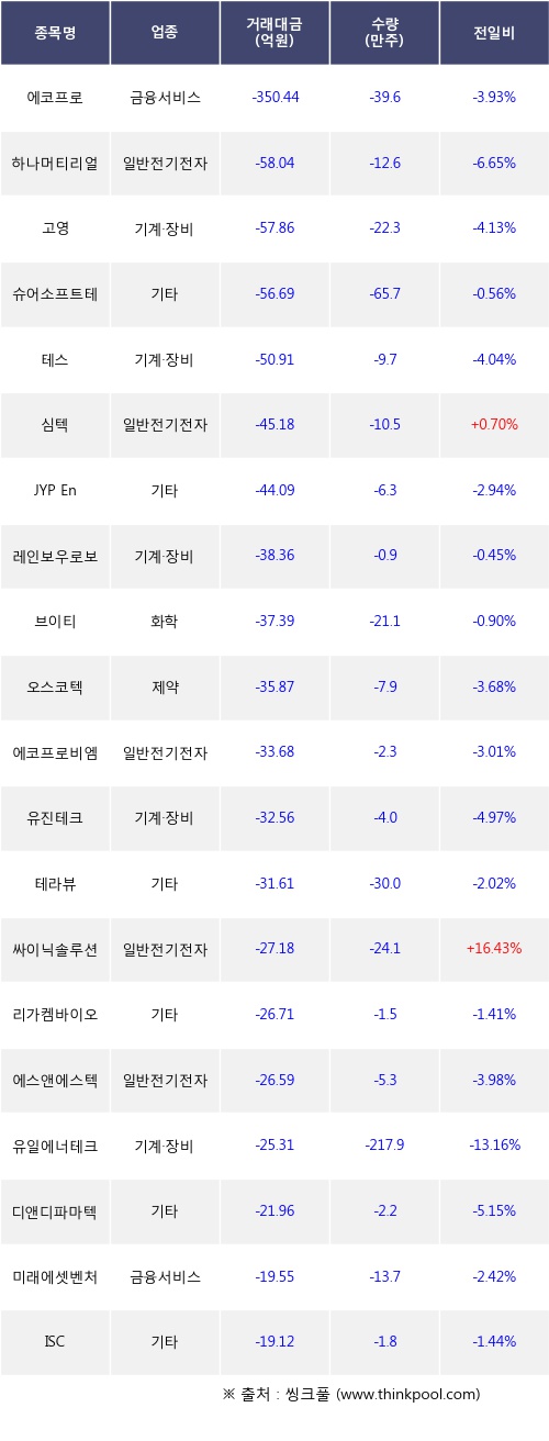 기관 투자자의 순매도 상위 20개 종목은 에코프로, 하나머티리얼즈, 고영, 슈어소프트테크, 테스, 심텍, JYP Ent., 레인보우로보틱스, 브이티, 오스코텍등이다.