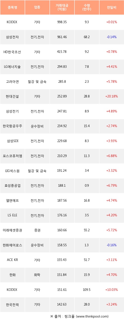 기관 투자자의 순매수 상위 20개 종목은 KODEX CD금리액티브(합성), 삼성전자, HD한국조선해양, LG에너지솔루션, 고려아연, 현대건설, 삼성전기, 한국항공우주, 삼성SDI, 포스코퓨처엠등이다.