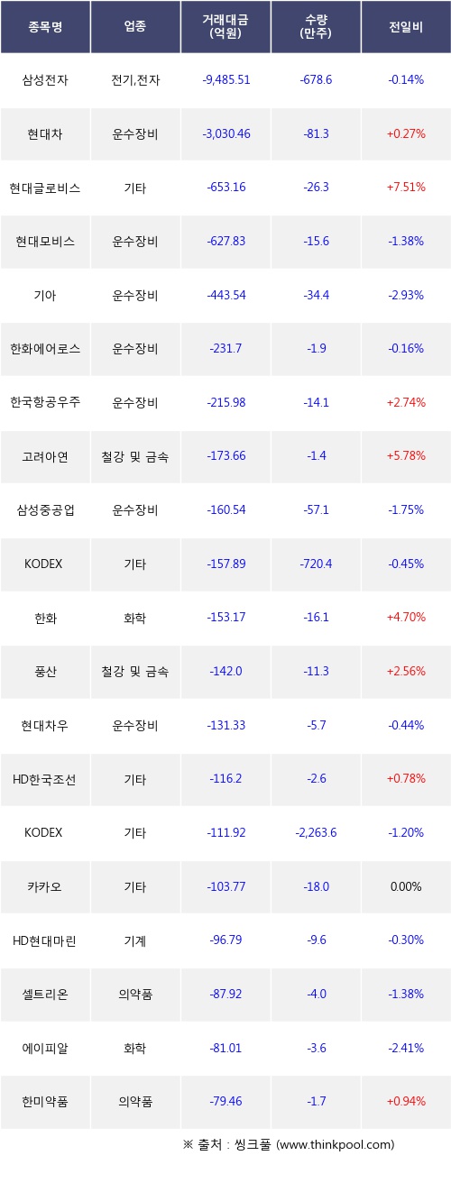외국인 투자자의 순매도 상위 20개 종목은 삼성전자, 현대차, 현대글로비스, 현대모비스, 기아, 한화에어로스페이스, 한국항공우주, 고려아연, 삼성중공업, KODEX 인버스등이다.