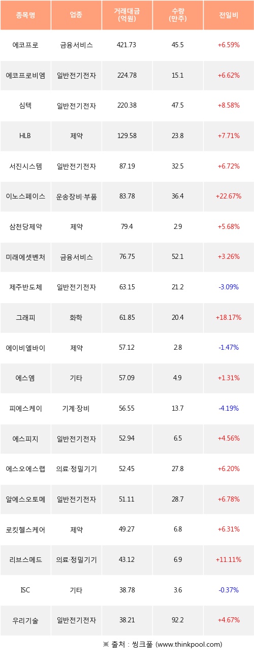 에코프로, 에코프로비엠, 심텍 등은 전일 대비 주가가 상승했고, 제주반도체, 에이비엘바이오, 피에스케이 등은 주가가 하락했다.