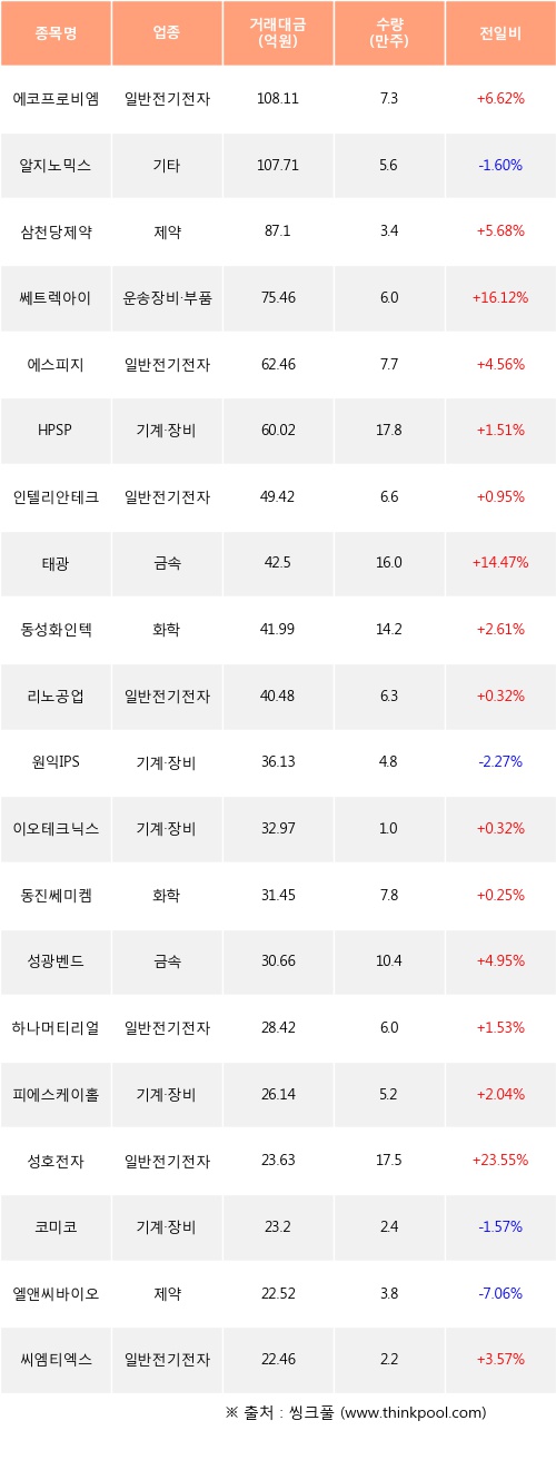기관 투자자의 순매수 상위 20개 종목은 에코프로비엠, 알지노믹스, 삼천당제약, 쎄트렉아이, 에스피지, HPSP, 인텔리안테크, 태광, 동성화인텍, 리노공업등이다.