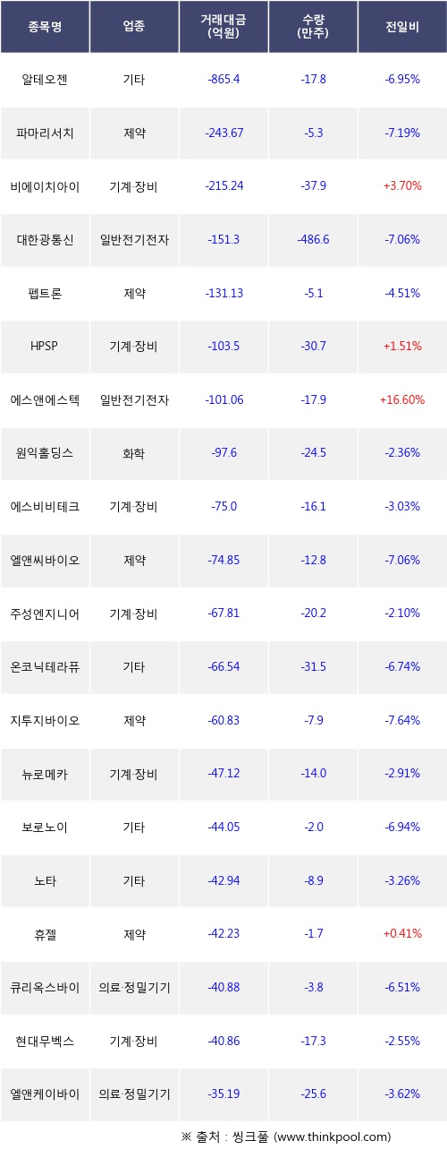 외국인 투자자의 순매도 상위 20개 종목은 알테오젠, 파마리서치, 비에이치아이, 대한광통신, 펩트론, HPSP, 에스앤에스텍, 원익홀딩스, 에스비비테크, 엘앤씨바이오등이다.