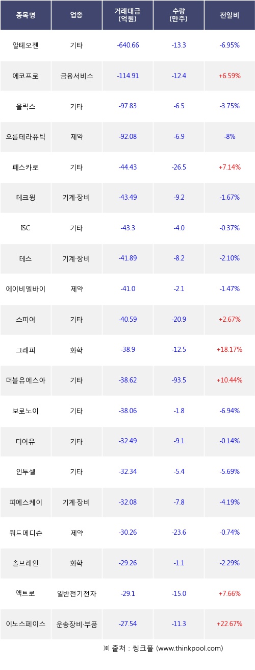 기관 투자자의 순매도 상위 20개 종목은 알테오젠, 에코프로, 올릭스, 오름테라퓨틱, 페스카로, 테크윙, ISC, 테스, 에이비엘바이오, 스피어등이다.