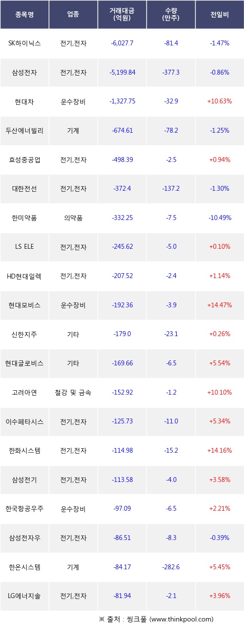 외국인 투자자의 순매도 상위 20개 종목은 SK하이닉스, 삼성전자, 현대차, 두산에너빌리티, 효성중공업, 대한전선, 한미약품, LS ELECTRIC, HD현대일렉트릭, 현대모비스등이다.