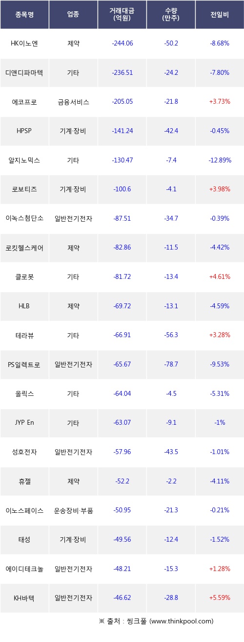 외국인 투자자의 순매도 상위 20개 종목은 HK이노엔, 디앤디파마텍, 에코프로, HPSP, 알지노믹스, 로보티즈, 이녹스첨단소재, 로킷헬스케어, 클로봇, HLB등이다.