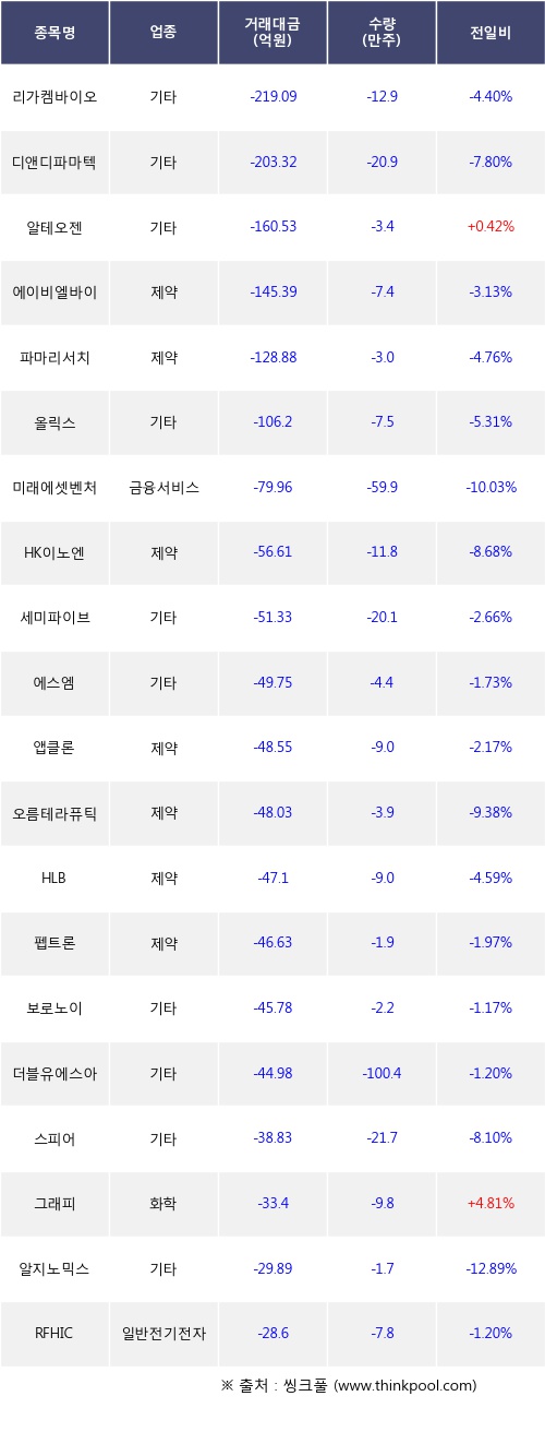 기관 투자자의 순매도 상위 20개 종목은 리가켐바이오, 디앤디파마텍, 알테오젠, 에이비엘바이오, 파마리서치, 올릭스, 미래에셋벤처투자, HK이노엔, 세미파이브, 에스엠등이다.