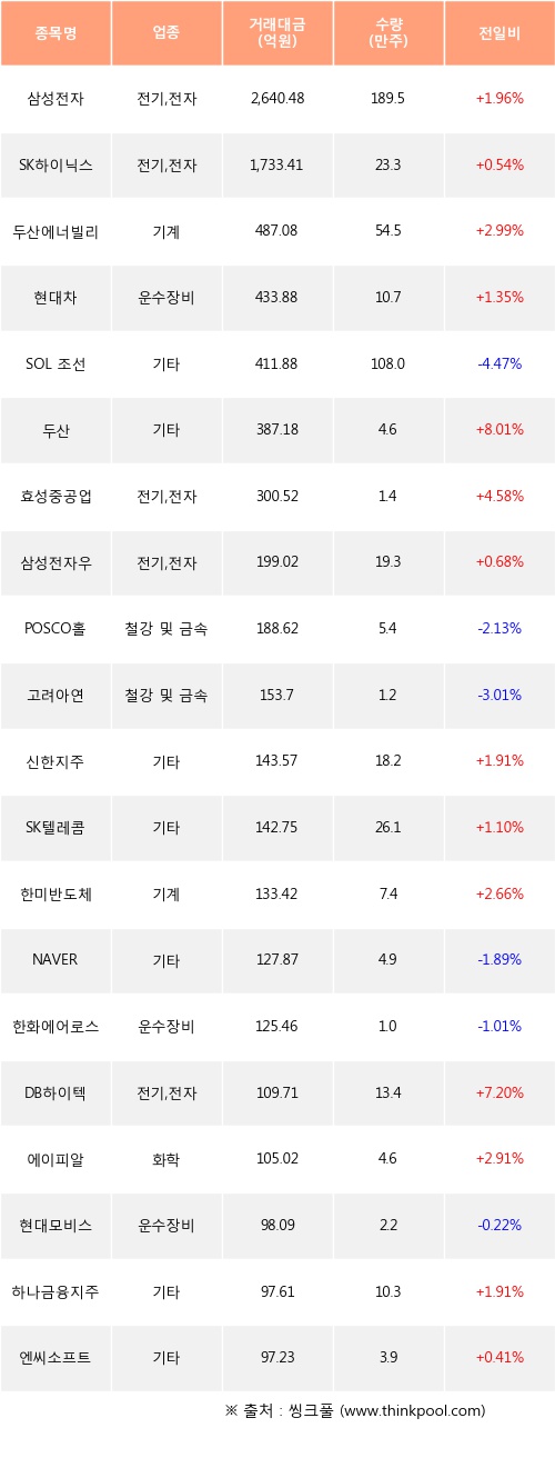 기관 투자자의 순매수 상위 20개 종목은 삼성전자, SK하이닉스, 두산에너빌리티, 현대차, SOL 조선TOP3플러스, 두산, 효성중공업, 삼성전자우, POSCO홀딩스, 고려아연등이다.