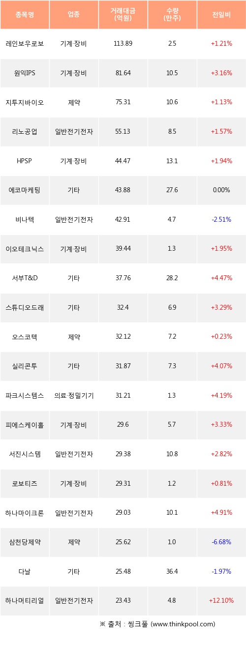 기관 투자자의 순매수 상위 20개 종목은 레인보우로보틱스, 원익IPS, 지투지바이오, 리노공업, HPSP, 에코마케팅, 비나텍, 이오테크닉스, 서부T&D, 스튜디오드래곤등이다.