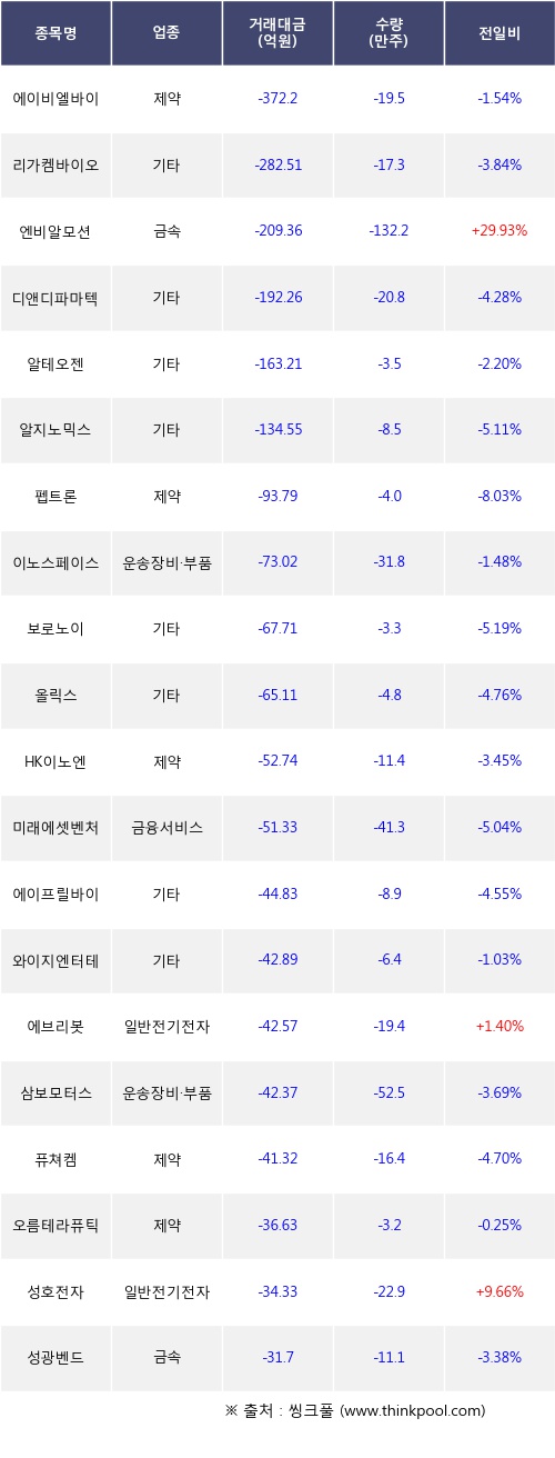 기관 투자자의 순매도 상위 20개 종목은 에이비엘바이오, 리가켐바이오, 엔비알모션, 디앤디파마텍, 알테오젠, 알지노믹스, 펩트론, 이노스페이스, 보로노이, 올릭스등이다.