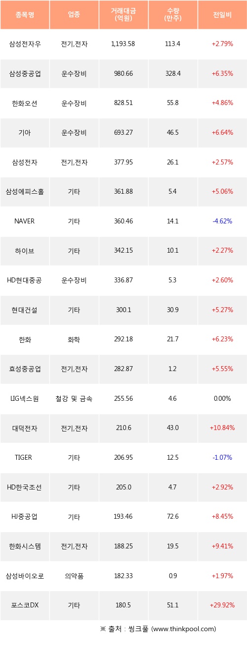 외국인 투자자의 순매수 상위 20개 종목은 삼성전자우, 삼성중공업, 한화오션, 기아, 삼성전자, 삼성에피스홀딩스, NAVER, 하이브, HD현대중공업, 현대건설등이다.