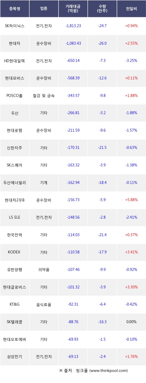 외국인 투자자의 순매도 상위 20개 종목은 SK하이닉스, 현대차, HD현대일렉트릭, 현대모비스, POSCO홀딩스, 두산, 현대로템, 신한지주, SK스퀘어, 두산에너빌리티등이다.