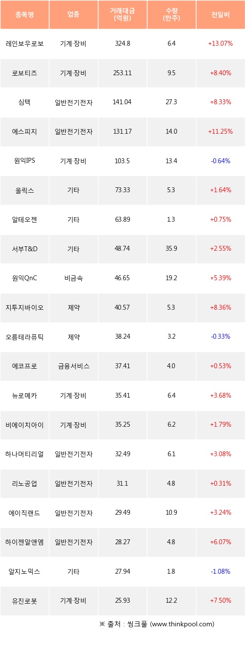 기관 투자자의 순매수 상위 20개 종목은 레인보우로보틱스, 로보티즈, 심텍, 에스피지, 원익IPS, 올릭스, 알테오젠, 서부T&D, 원익QnC, 지투지바이오등이다.