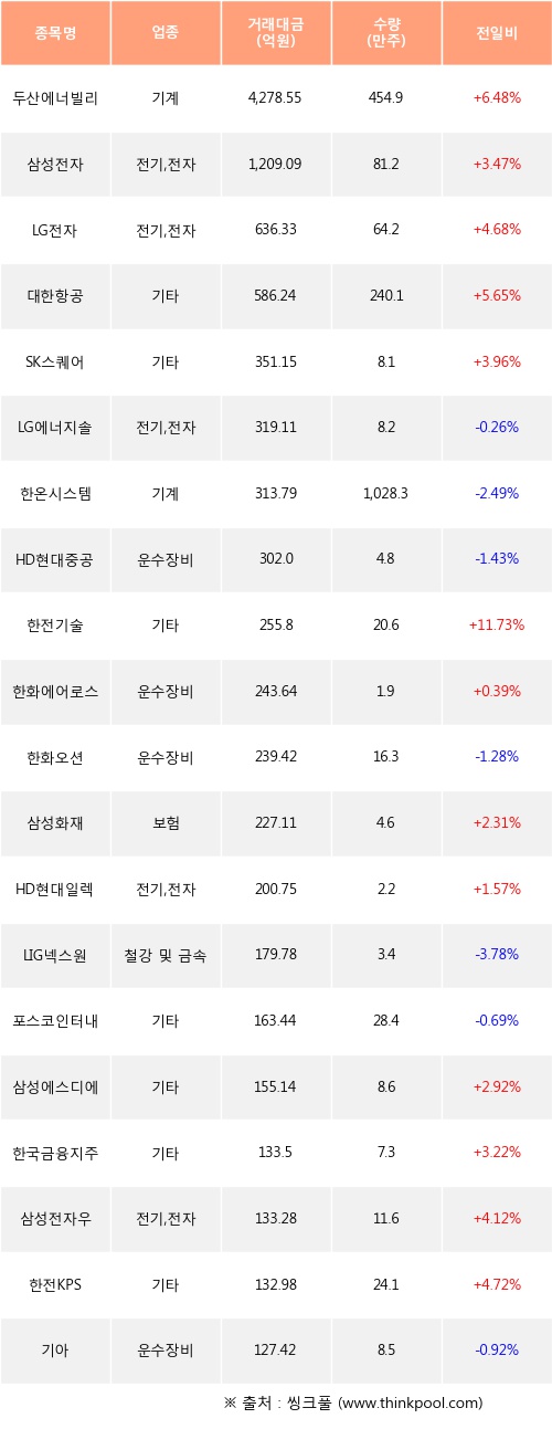 외국인 투자자의 순매수 상위 20개 종목은 두산에너빌리티, 삼성전자, LG전자, 대한항공, SK스퀘어, LG에너지솔루션, 한온시스템, HD현대중공업, 한전기술, 한화에어로스페이스등이다.