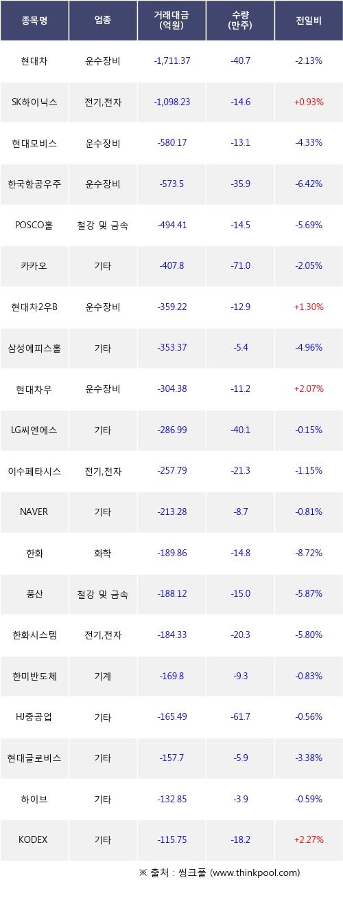 외국인 투자자의 순매도 상위 20개 종목은 현대차, SK하이닉스, 현대모비스, 한국항공우주, POSCO홀딩스, 카카오, 현대차2우B, 삼성에피스홀딩스, 현대차우, LG씨엔에스등이다.